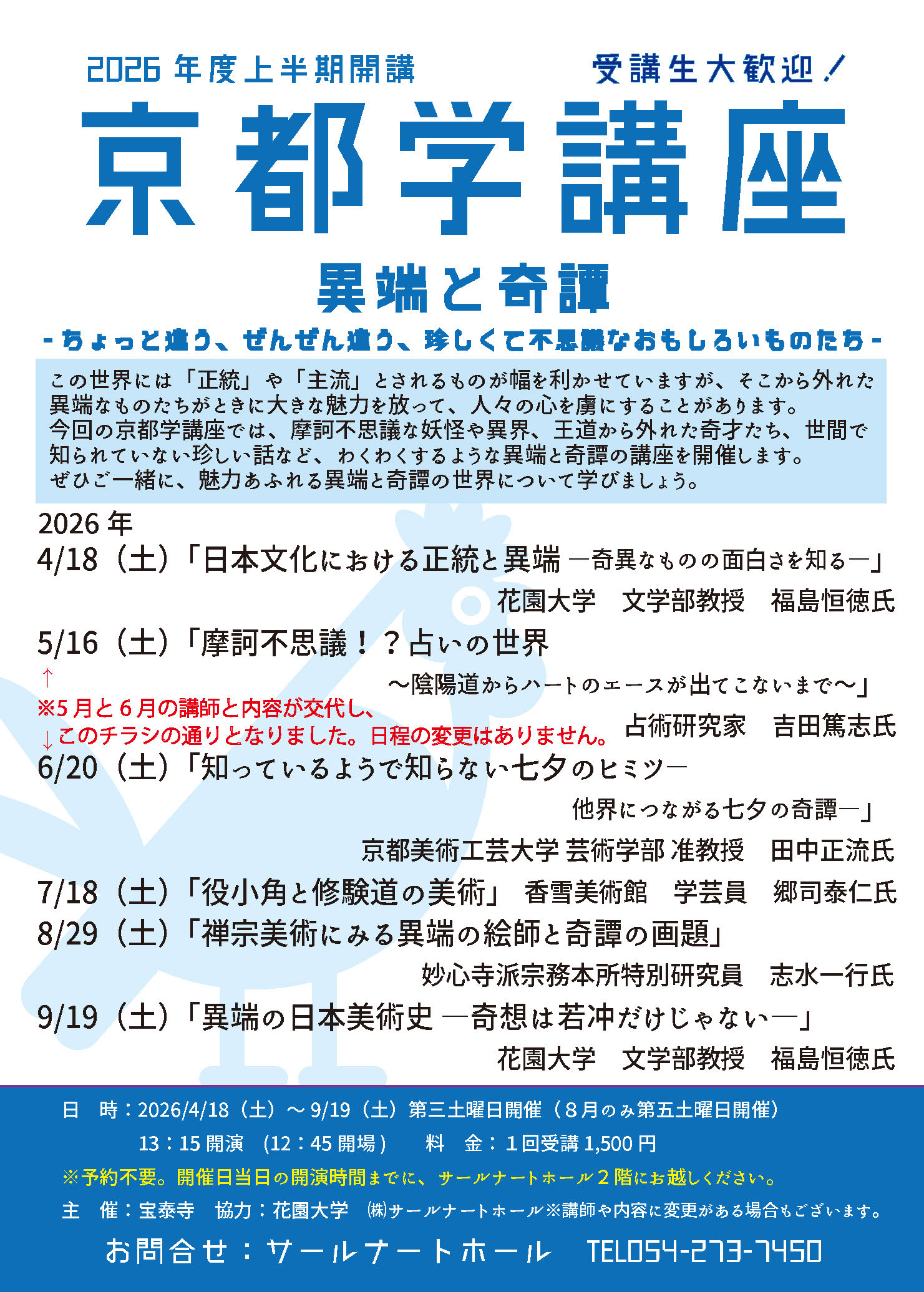 今回の京都学講座では、摩訶不思議な妖怪や異界、王道から外れた奇才たち、世間で知られていない珍しい話など、わくわくするような異端と奇譚の講座を開催します。