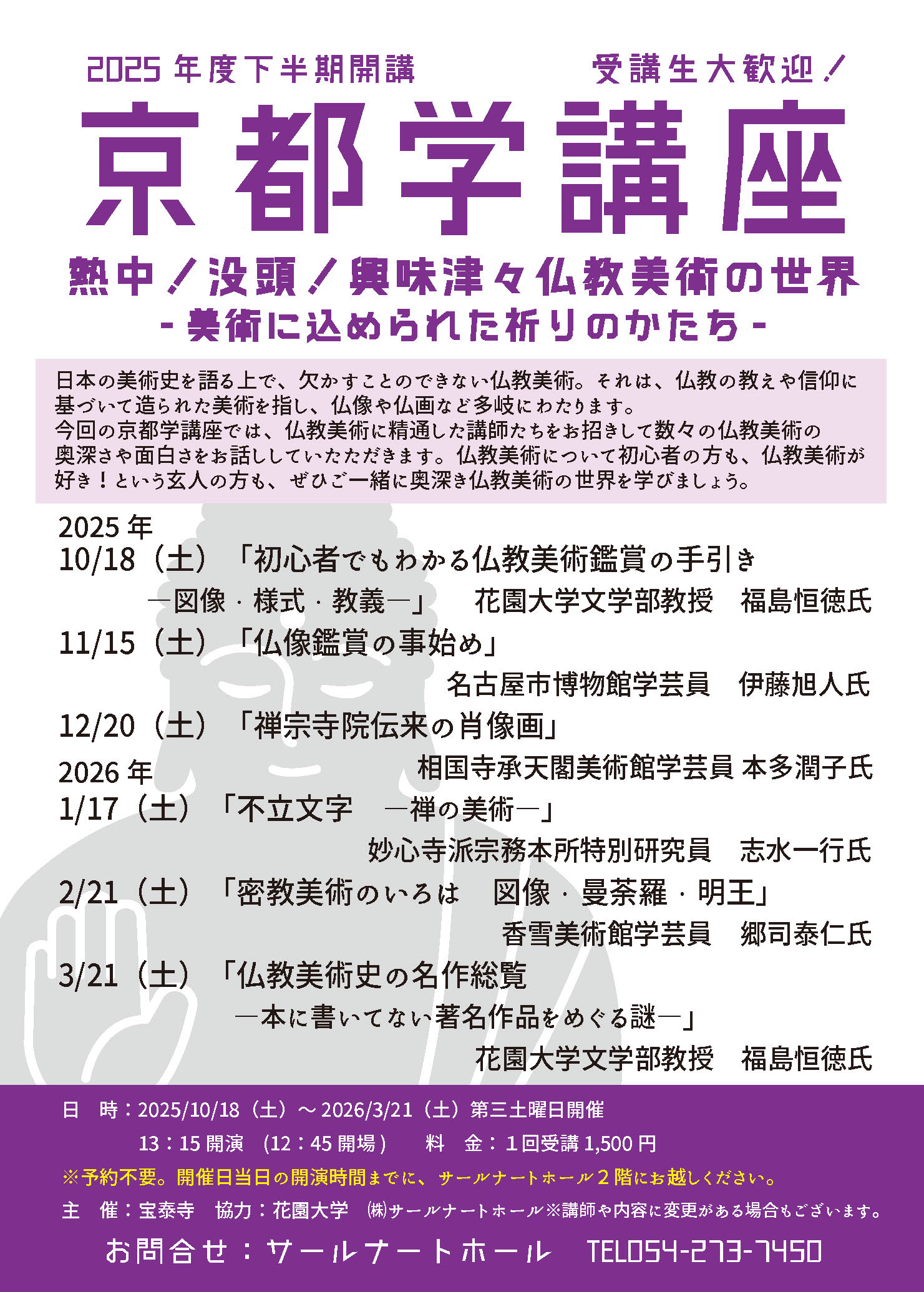 今回の京都学講座では、仏教美術に精通した講師たちをお招きして数々の仏教美術の奥深さや面白さをお話ししていたただきます。